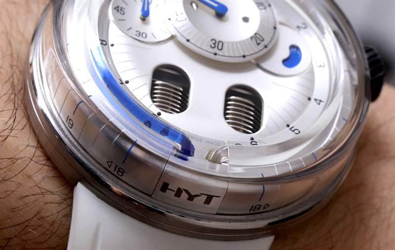 提醒您,HYT 最初是“流體機械鐘表師”。如果你不知道那是什么意思,那沒關(guān)系。這里的含義是所有 HYT 手表都使用液體作為機械機芯顯示時間的方式的一部分。藍寶石水晶“毛細管”管系統(tǒng)充滿有色液體。液體沿著管子移動以指示分鐘,由波紋管系統(tǒng)提供動力,該系統(tǒng)使用兩個波紋管式腔室來移動液體的相對位置。該系統(tǒng)已被證明是相對穩(wěn)健且具有視覺吸引力的。因此,您可以看到管道系統(tǒng)的幾乎整個圓圈,它運行一個很長的“小時”指示器軌道。其他表盤用于分、秒和機芯動力儲存指示。廣告訊息廣告信息結(jié)束