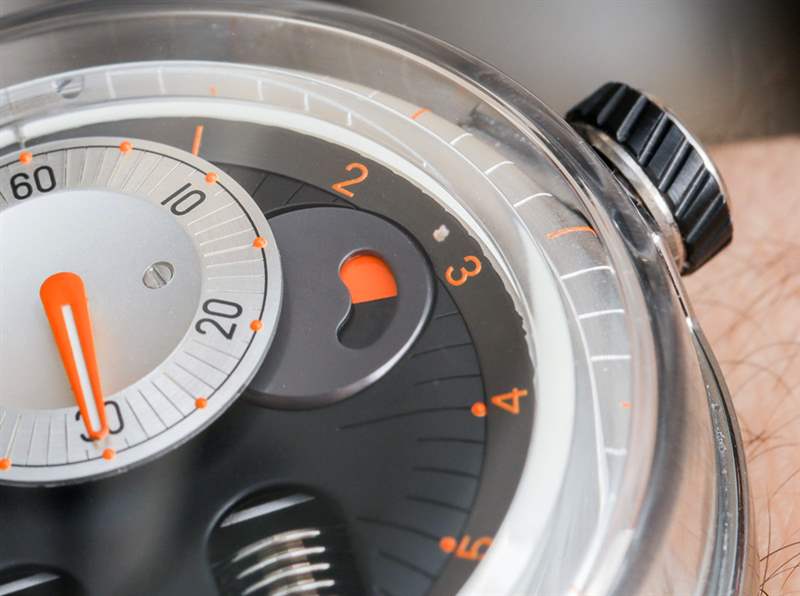 您可以從表殼側(cè)面讀取表盤的小時部分,上面有 24 小時標記,它不太有用,但提供了更多功能。正上方是藍寶石水晶管,里面裝有時間指示液體以顯示小時。在 H0 Silver 中,液體是可愛的藍色,H0 Orange 為黑色,H0 Black 為綠色。綠色和藍色的流體顏色是最清晰的。值得一提的是,發(fā)光體是如何應(yīng)用到表盤上的。毛細管下面有一條發(fā)光體(很酷),還有傳統(tǒng)手上的發(fā)光體。