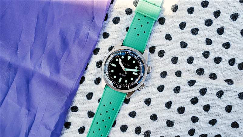 誠然,這種顏色的使用可能會使手表在金屬中看起來非常愚蠢。但是在手腕上花一些時間可以鞏固波羅的海幾乎釘住了 90 年代的氛圍。這里的穿著體驗很有趣。我立即想起了我年輕時更多“外面”的數字手表——Shark Freestyle、G-Shock 和 Timex。波羅的海將這種幼稚的奇思妙想提煉成一個更成熟、完全機械的包裝。它的 39 毫米表殼尺寸和 47 毫米表耳到表耳長度也非常適合佩戴。此外,鉆孔表耳可在紫色和綠松石綠色表帶之間輕松切換。
