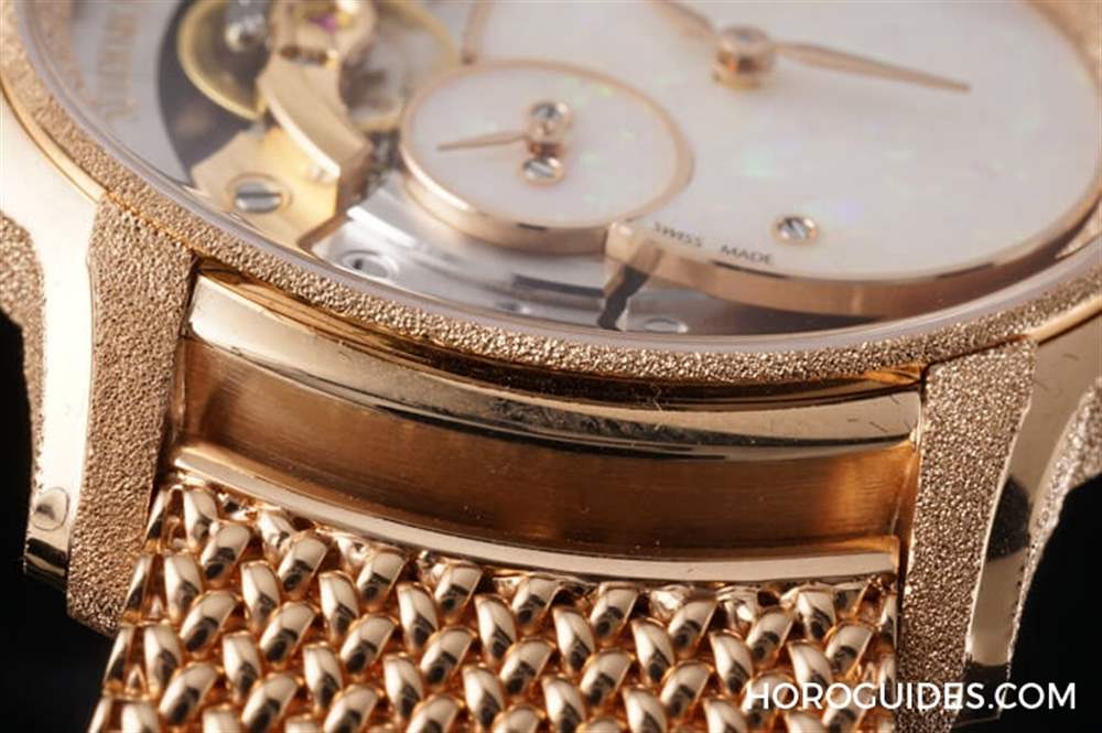 除此之外,在今年愛彼推出大受好評的霜金Royal Oak,其中閃到不行的霜金工藝也使用在另一款Millenary新作,其表圈以及內表圈、表耳的部分都以霜金工藝做裝飾,而表盤也是愛彼Millenary第一次采用蛋白石制作,為Millenary裝飾不一樣的「表」情。