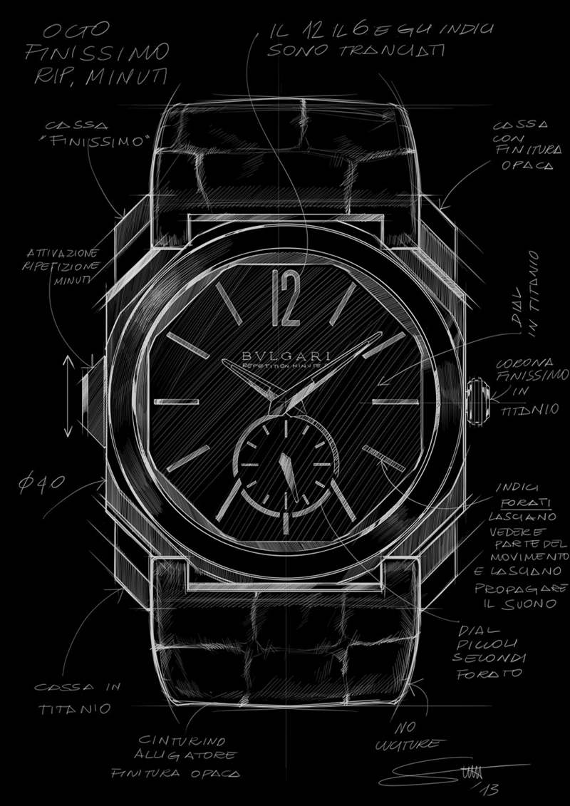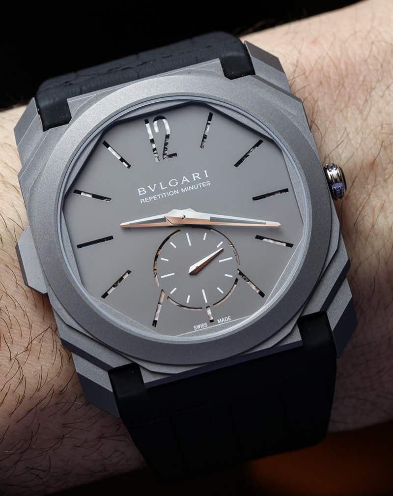 在噴砂鈦中,這種近乎工業的表面處理并不是大多數人對高端奢華手表的期望。話雖如此,鈦是用于三問報時表的最佳材料之一,因為它的特性不會減弱報時的聲音。黃金或鉑金等貴金屬是響亮的三問表的大敵,而當您想要最響亮、最清晰的聲音時,鋼和鈦是更好的選擇。寶格麗不僅將鈦用于表殼材料,還用于表盤。如果仔細觀察,您會注意到寶格麗 Octo Finissimo 三問報時腕表最有趣的設計細節之一:鏤空時標和小秒盤。這不僅僅是為了風格,而是作為幫助聲音傳播的一部分,從而充分利用內部空間讓鈴聲產生共鳴。
