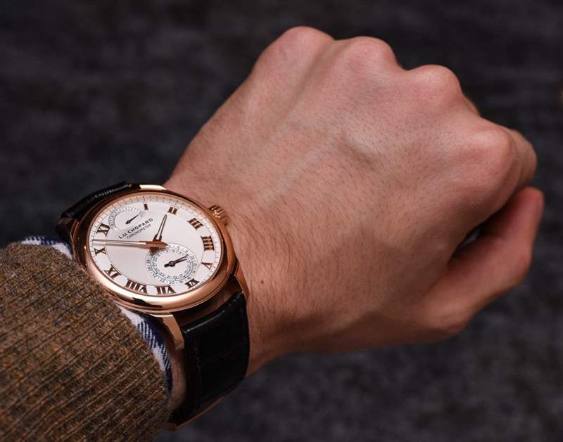 蕭邦 LUC Quattro 的寬度為 43 毫米,對于大多數人來說,它的正裝表應該是較大的一端(但一點也不厚,為 8.87 毫米)。為了舒適起見,蕭邦使用了漂亮的傾斜表耳。如果您喜歡寬邊的正裝手表,那么您一定會喜歡這個尺寸。如果您習慣了更小巧的禮服時計,那么蕭邦 LUC Quattro 可能不適合您——但蕭邦當然還有其他更小的選擇(它們的動力儲存不會超過一周)。