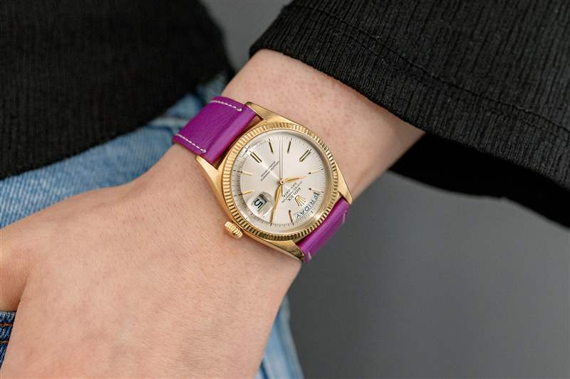 又過了一周,我的另一個選擇是勞力士——處理它。我在古董表的世界里花的時間越多,我就越尊重這個品牌。我最初是一名年輕的收藏家,對勞力士的想法避而遠之,因為最重要的是,它不在我的價格范圍內,我想找到一個理由來愛上我平流層中可以找到的品牌。我花在 1940 年代、50 年代、60 年代等所有這些手表上的時間越多,勞力士就越經得起考驗。以這款 1961 Day-Date 為例,其設計顯然是標志性的,但我發現更有趣的是它的耐用性——這款手表既可以是 1991 年的,也可以是 1961 年的。也就是說,除非你可以發現細節。