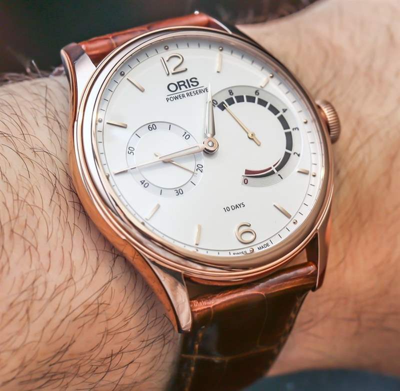 更有趣的是整整 240 小時或 10 天的動力儲存長度。這意味著 Oris Calibre 110 在以 21,600 bph (3Hz) 的頻率運行時,可以在繞組之間運行一周以上。表盤上的“10 天”小標簽提醒您這一事實。那個較低的標簽我不介意,但我確實認為 Oris 在他們的品牌標志下印刷“Power Reserve”并不是特別有用。這就像汽車公司在車身上放置無用的標簽和標志一樣。我記得我在成長過程中看到諸如“燃油噴射”和“全輪驅動”之類的愚蠢的東西出現在汽車的側面或后部。這會喚起品味和區別嗎?這對路上的其他汽車是否有某種有價值的用途?或者這只是某種奇怪的廣告,目的是幫助車主對他們的購買感覺更好,并且讓鄰居們意識到他們自己的汽車可能沒有這樣的功能。就個人而言,我不希望我的車上有那些東西。