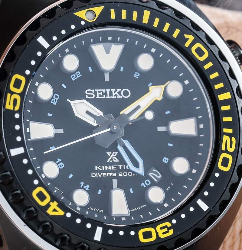 Seiko Prospex Kinetic GMT Diver 腕表最顯著的細節(jié)是表盤的立體感。凸起的時標確實讓指針不能像我們想要的那么長,但易讀性仍然很高,表盤在視覺上非常引人注目。三款 Seiko Prospex Kinetic GMT Diver 腕表的表盤顏色略有不同,但每一款都讀起來很有趣和愉快。除了您在潛水表上期望的普通指針外,這款時計還是格林威治標準時間。因此,表盤上有第四根指針用于第二時區(qū),這使它不僅是一款不錯的運動表,而且是一款不錯的旅行運動表。