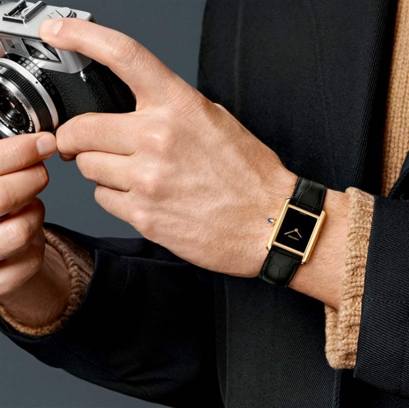 筆者的心水之選則是這枚配上黃金表殼的Tank Louis Cartier Watch,表面是最精簡的「無字天書」,而金殼與黑面這個組合,感覺既懷舊,但又不失時尚感;最后在表冠鑲嵌一顆凸圓形藍(lán)寶石,注入卡地亞的經(jīng)典優(yōu)雅。腕表厚度更纖薄至6.6mm,上手貼服舒適,這要歸功于厚2.9mm的1917 MC手動上鏈機(jī)芯,造就纖薄手感,襯衫自然更無慮。