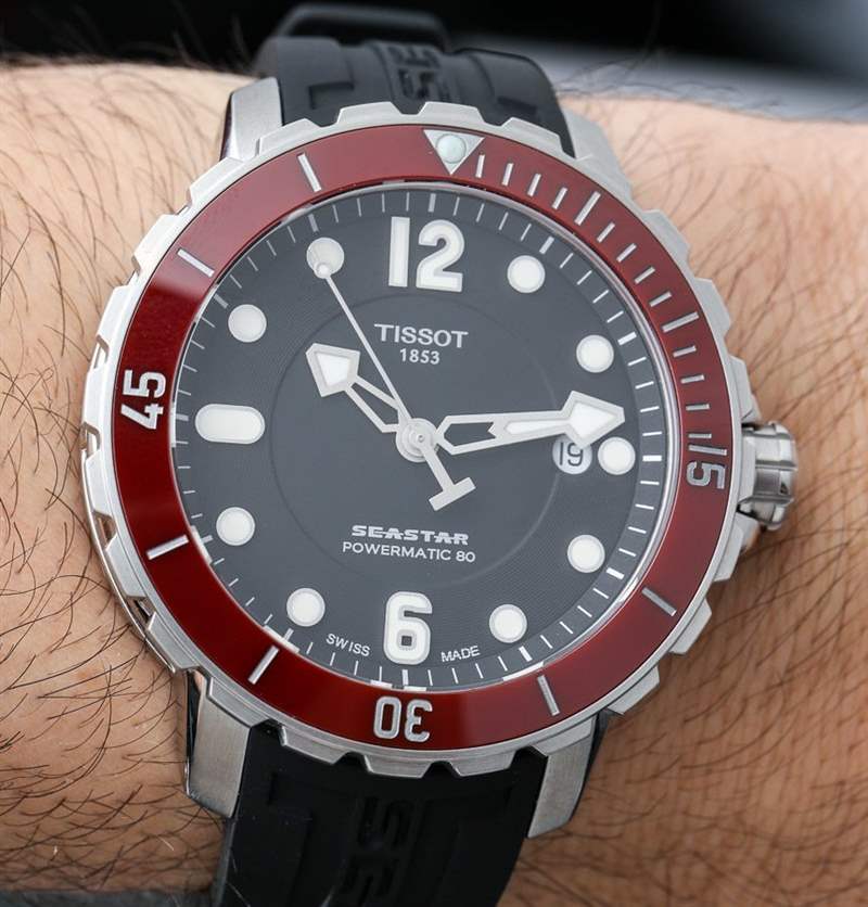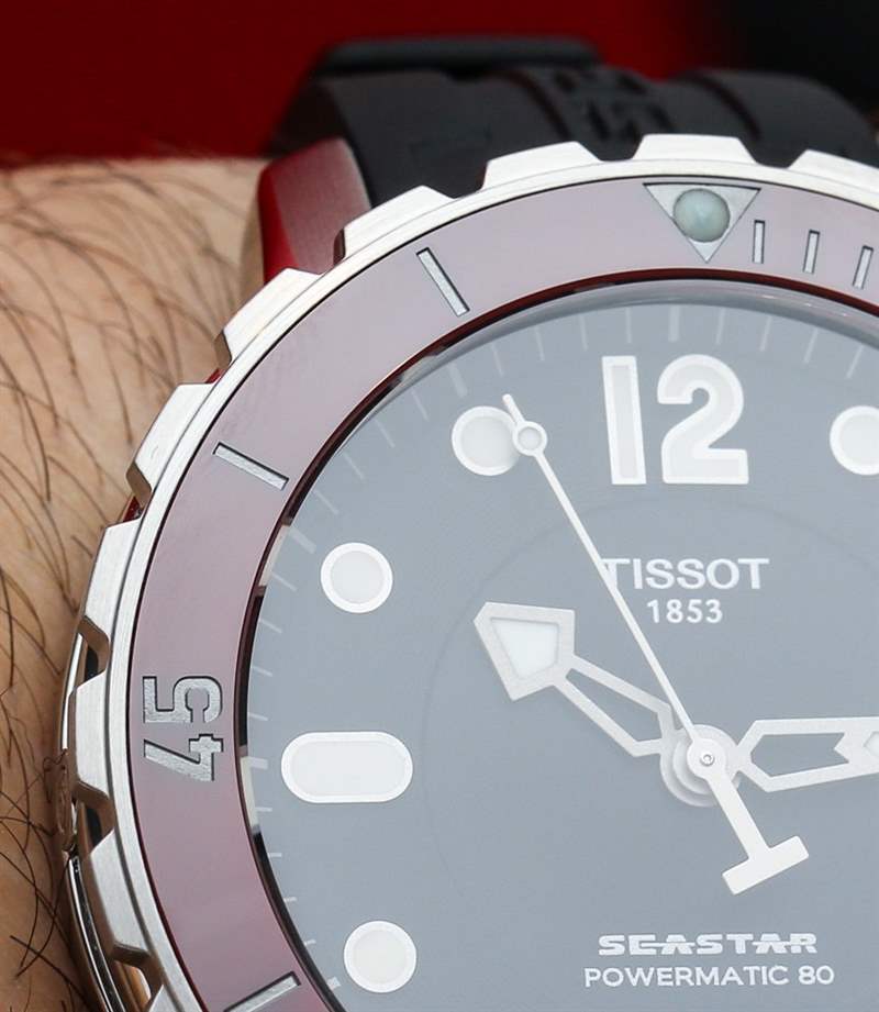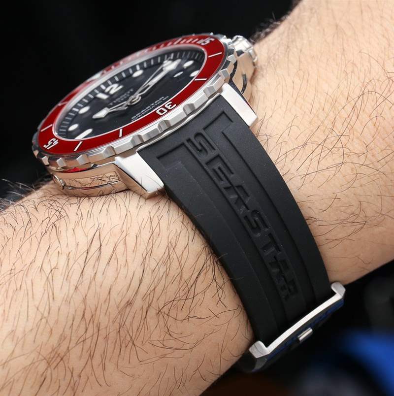 如果將 2013 年和 2014 年的 Seastar 1000 手表并排放置,需要一分鐘才能看出兩者之間的差異。不過有很多。讓我們從擋板開始。2014 年,天梭為 Seastar 配備了陶瓷表圈嵌件,有藍色、黑色和栗紅色可供選擇。當然,后者賦予腕表黑色和紅色調,類似于非常時尚的帝舵Heritage Black Bay。實際上,陶瓷表圈插件相當不錯。它們不僅僅是一個扁平的環,而是在表圈與表盤相接的地方稍微傾斜一點,標記實際上是切入表圈而不是印在表圈上。