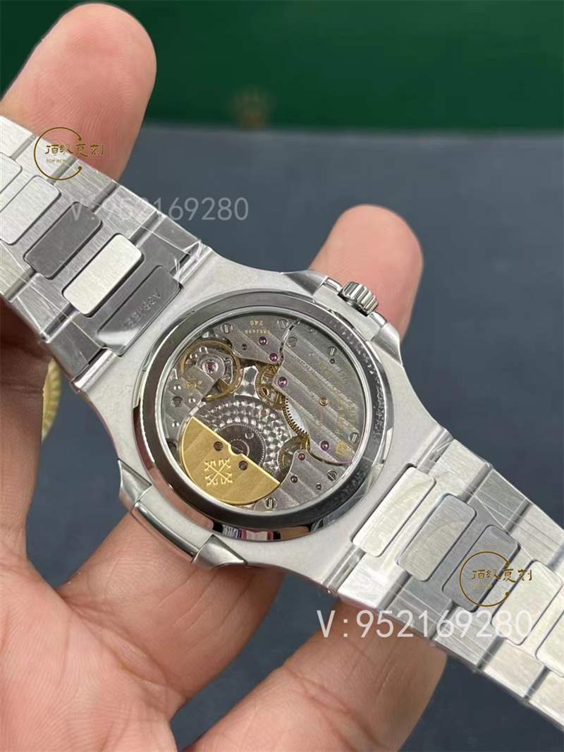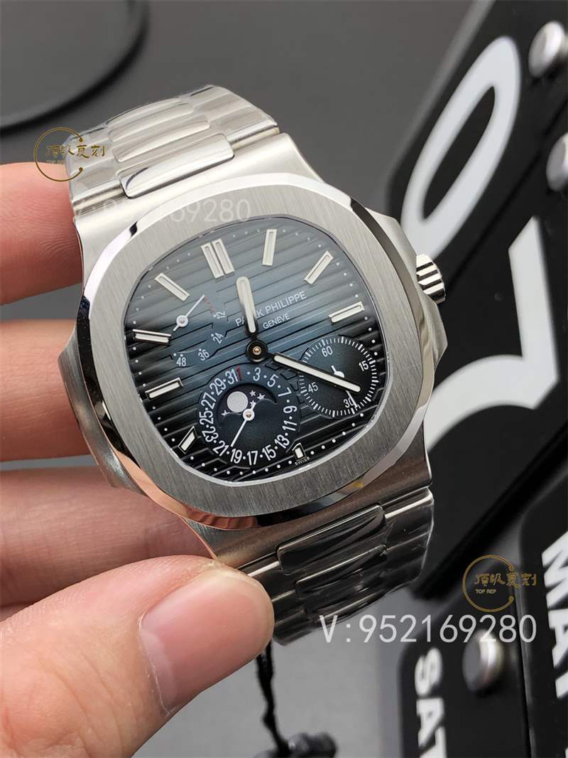 1?,相信很多表迷對這款表都比較了解,ZF廠鸚鵡螺5712直徑40毫米,同步正品尺寸,不過厚度上還是厚了一點,畢竟此款原裝的機(jī)芯超薄,而復(fù)刻想要達(dá)到原裝的厚度在機(jī)芯上難以實現(xiàn),所以略厚一點。表殼兩側(cè)略微凸起的鉸肩設(shè)計,像是兩只小巧的耳朵,通過鉸肩固定兩件式表殼,也增加了腕表的防水性能。表殼采用進(jìn)口精鋼材質(zhì)鍛造而成,平面經(jīng)過細(xì)膩緞面拉絲,邊角處經(jīng)過反復(fù)倒角打磨,刻度采用的是不規(guī)則的立體時標(biāo),邊角經(jīng)過打磨處理,展現(xiàn)細(xì)膩的質(zhì)感并且完全沒有毛刺感,做工細(xì)節(jié)到位,指針刻度均勻覆蓋了進(jìn)口夜光涂料,夜光明亮黑暗環(huán)境可正常讀時。