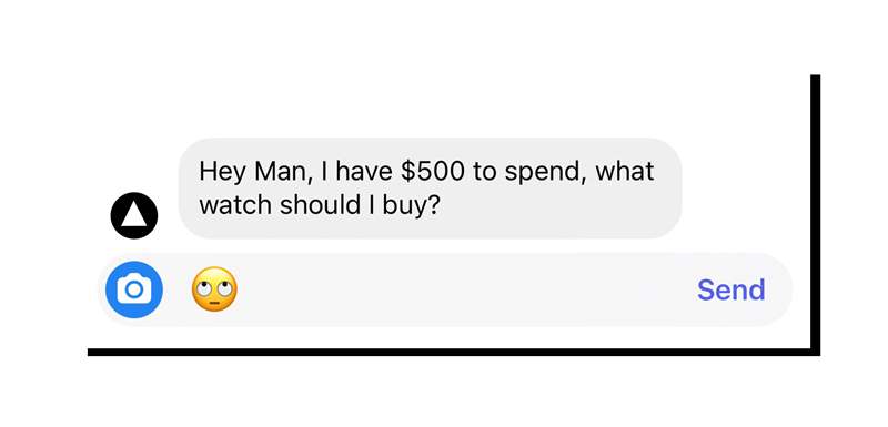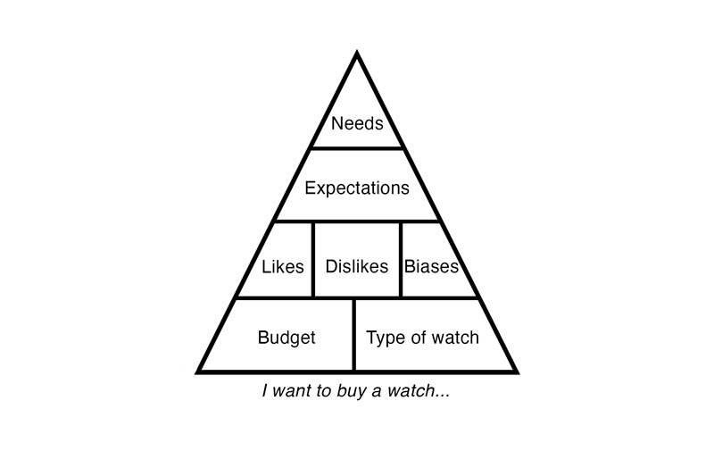 您需要提供背景,而不是向具有無數選擇的市場提供預算和廣泛開放的請求。價格不錯,手表的類型也不錯,但兩者都代表金字塔底部的塊,您的目標應該是為您選擇的專家提供足夠的塊以到達特定點。如果你尋求我的幫助,那么我們正在一起建造這個金字塔,我們的目標應該是從一般性——算法可能推薦的任何受人尊敬的手表——到具體的,希望能發現一款可能不適合的手表已經在你的雷達上。