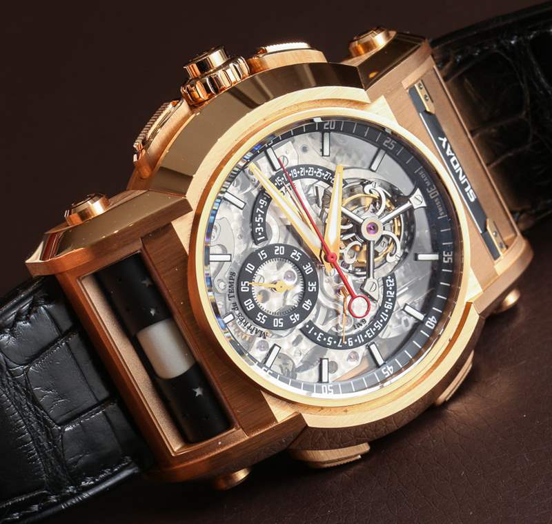 滾輪是第一章模型如此龐大的原因之一。滾輪主要由鋁制成,是該系列設計 DNA 的重要組成部分。它們用于在手表的頂部指示月相,在手表的底部指示星期幾。Chapter One 手表的另一個獨特之處(我認為其他任何手表都不存在)是按鈕中的特殊安全桿。推動者不是第一章所缺乏的東西。實際上,整個案件中有五個。
