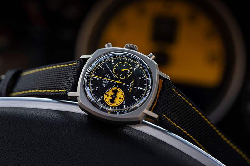 第一款也是最明顯的蝙蝠俠手表是 The Caped Crusader,這款漂亮的墊式鈦金屬計時碼表采用英雄的黑色和黃色制服。這種黃色不僅可以在分鐘小表盤的標志上找到,還可以在測速儀的邊緣和表帶上的對比色縫線周圍找到。
