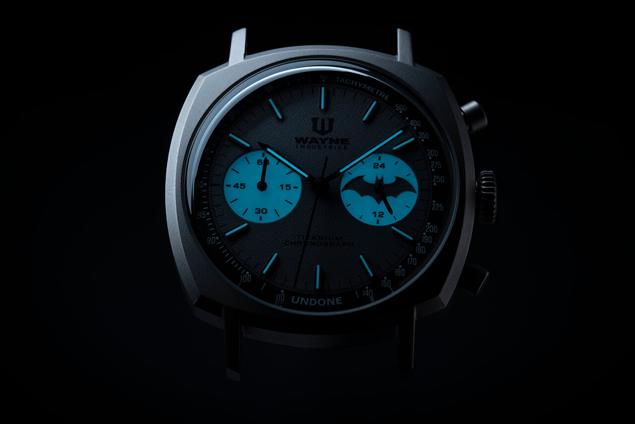這對中的第二個稍微低調一些。事實上,如果不是因為 3 點鐘位置的小表盤上的更尖、更現代的蝙蝠標志,參考了諾蘭三部曲的黑色鏡頭,它簡直就是一款漂亮的鈦金屬墊殼手表。它再次出現在晚上玩,兩個小表盤都閃爍著蝙蝠車喜歡的相同霓虹藍。