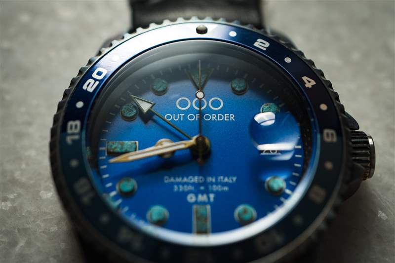 Out of Order Oxidized Green GMT New York 從自由女神像的氧化銅中汲取靈感——可以在底蓋上找到——帶有充滿活力的祖母綠表盤,在深黑色的環(huán)繞中漸暈。帶紋理的綠色銅銹在所應(yīng)用的時(shí)標(biāo)上完美呈現(xiàn),層層疊疊的銅綠色讓位于下方銅的光澤。這些相同的時(shí)標(biāo)也出現(xiàn)在 Very Blu GMT New York 上,雖然它們與這個(gè)版本的藍(lán)色主題不太相配,但白色的夜光周圍有助于提高易讀性。
