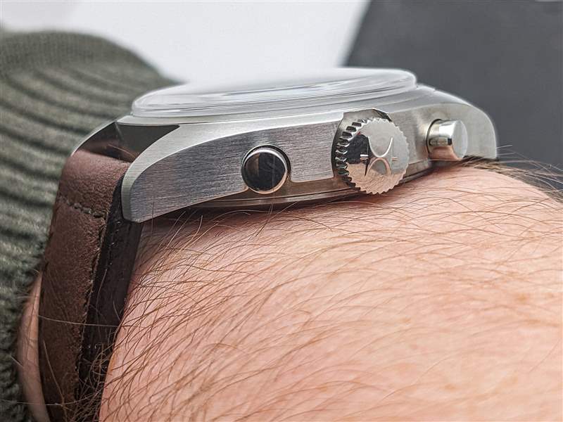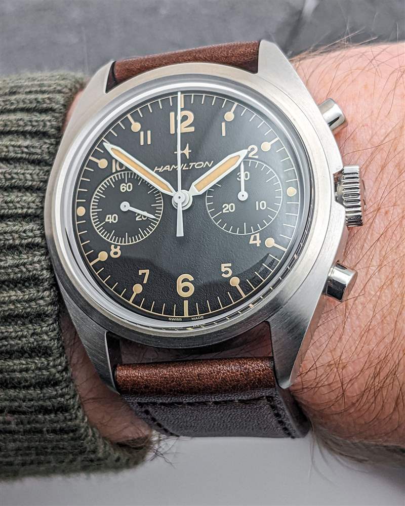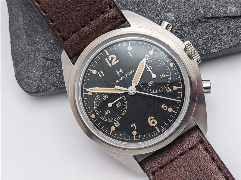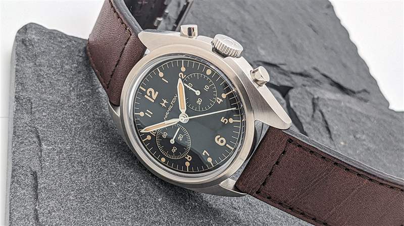 漢米爾頓為 Khaki Pilot Pioneer 機械計時碼表搭載 H-51-Si 手動上鏈計時機芯。H-51-Si 是可追溯至 Valjoux 7753 的血統中的最新發展,但盡管基本平臺年代久遠,但這是一款堅固的現代動力裝置。除了高端硅游絲外,H-51-Si 還提供強勁的 60 小時動力儲存,振頻為 28,800 bph。H-51-Si 計時碼表的按鈕動作出奇地輕巧,但足夠靈敏,可以在操作過程中提供令人愉悅的觸覺反饋。該機芯的準確性也很可靠,在我們的審查期間平均每天 +5 秒。