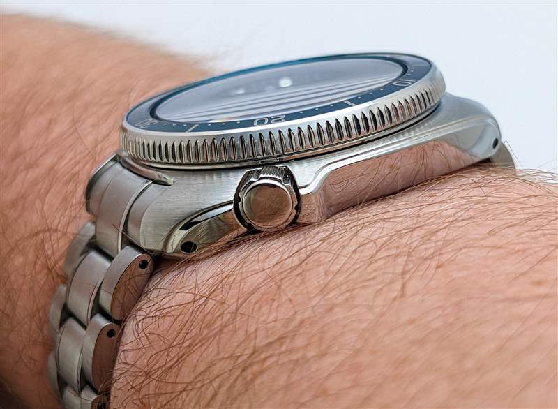 與許多 Seiko 表殼一樣,Prospex SLA063 在實踐中違背了它的尺寸。由于短表耳和嚴重的表殼底切相結合,最大限度地減少了其在手腕上的足跡,因此這款手表的佩戴比其 44 毫米寬的直徑建議的要小得多。精工專有的超硬涂層應該有助于這款表殼在購買后很長一段時間內保持無劃痕,同時不會放棄不銹鋼的傳統外觀。話雖如此,SLA063 外殼的特殊形狀可能并不適合所有口味,尤其是在這個(相對)較高的價格點,愛好者更習慣于傳統的豪華潛水員設計。Seiko 在這款表殼的頂部飾有堅固的雕刻底蓋,底蓋上印有該品牌熟悉的波浪標志,并為這款手表評定為符合 ISO 標準的 200 米防水性能。