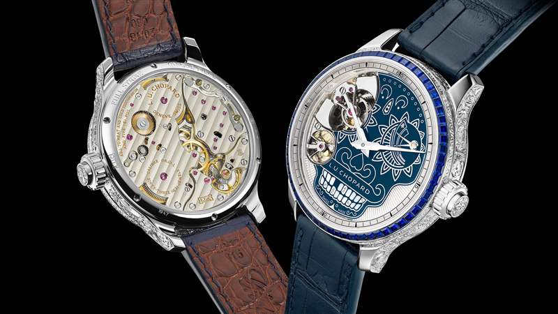 手表的制作和組裝分幾個步驟進行。表殼由 18k 白金(通過蕭邦的道德黃金供應鏈采購)制成,并在表殼帶上精心雕刻了以亡靈節(jié)為靈感的圖案,包括卡拉維拉斯、風格化的吉他和花卉設計。雕刻非常復雜,延伸到表耳,當然還有表冠,表冠也飾有卡拉維拉。