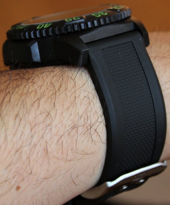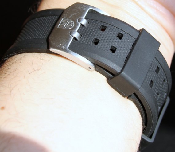 我真的很喜歡橡膠表帶的尺寸和手感。它具有金屬雙銷式搭扣,并具有厚實(shí),堅(jiān)固和紋理的感覺。Luminox選擇不用黑色涂層金屬表扣來包裝黑色表殼,而是使用帶有Luminox標(biāo)志的拉絲金屬表扣。老實(shí)說,我一點(diǎn)也不介意顏色差異。