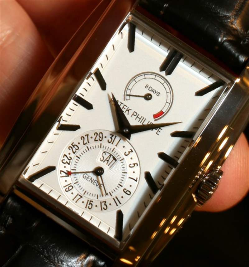 很難抗拒“啞光藍色旭日形”表盤(如百達翡麗的稱呼)的魅力,但加上拋光的太妃糖指針,在光線下的易讀性并不理想。盡管如此,盡管矩形表盤的比例令人尷尬,但就可讀性而言,百達翡麗在指針和應用時標方面做得很好。“銀白色蛋白石”表盤非常棒。非常輕,它與那些啞光黑色混合得非常好。百達翡麗是目前生產這些深黑色但細節豐富的黑色指針和時標的王者。
