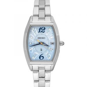 Lukia可算是精工表中最受歡迎的女士手表系列,專為年輕職場女士而設(shè)計,造型大方而優(yōu)雅。此表別致地以酒桶形表殼襯上精鋼表鏈,淺藍表面綴以深藍指針,時標(biāo)則為深藍與白色的數(shù)字配搭,再襯有幾顆碎石,在平凡中盡顯閃爍之色,配搭各類衣著亦見相宜。