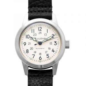 此表屬Bulova的Hack系列,是以二戰(zhàn)美國軍表為原型的復(fù)刻類手表。此表以黑色皮革表帶襯上原色精鋼圓形表殼,表面以象牙色表盤置上軍表特有的1至12及13至24雙數(shù)字圈黑色刻度,清晰而俐落,卻又不落俗套,能輕易在面試時流露你靈活多變的一面。