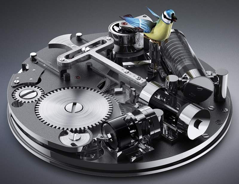 47 毫米寬 18k 白金表殼側面的縫隙可讓聲音從機芯內部逸出,活塞式哨子發出鳥鳴聲。這個迷人的鳥的原型版本還有一些工作要做,包括改進和完成機芯,為歌曲提供更強勁的聲音,以及為表殼添加適當的表冠(不需要工具來為自動裝置上鏈)最終產品)。