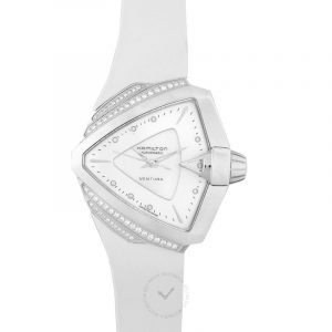 此表屬于漢米爾頓表(Hamilton)的探險(Ventura)腕表系列,系列早在上世紀五十年代就已面世,此表以鑲鉆的設計展現時計的雋永之色。白色橡膠表帶襯上標志性的類三角形精鋼表殼,殼緣及表面鑲滿美鉆,璀璨動人;表背采用透視設計更顯澄明。如果妳今天的白色戰衣注定要艷壓全場的話,此枚腕表將會是妳不可或缺的隨身裝備。