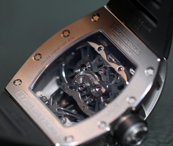 熟悉 Richard Mille 的人都知道他們承諾將陀飛輪用于它們不屬于的活動。在這里,據說 RM 053 的外殼相當抗震,但我個人不想用我的毛錢來測試它。表殼高 50 毫米,寬 42.70 毫米,厚 20 毫米。對于如此小的觀看區域,這仍然是很多手表。當然,你需要說清楚你戴的是 Richard Mille 對吧?