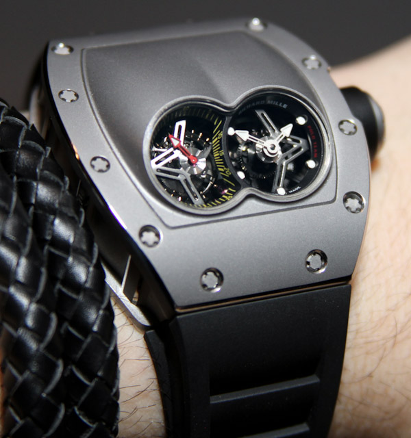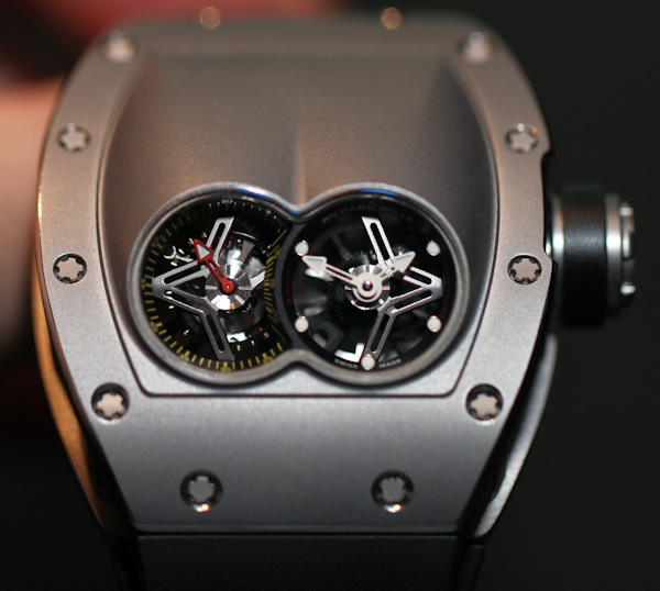 然后是設計問題。每個表盤都從表殼中流出,后面有兩個拱形。結果是表殼上看起來像乳溝。胸部或臀部乳溝——你自己決定。如果裂紋不足以讓您微笑,珠眼式表盤應該可以。這款手表甚至看起來像一個有趣的小機器人的頭部,我真的很想自己制作。這很容易成為最奇怪的 Richard Mille 手表之一,而且只有 15 個。