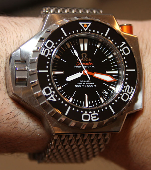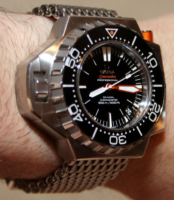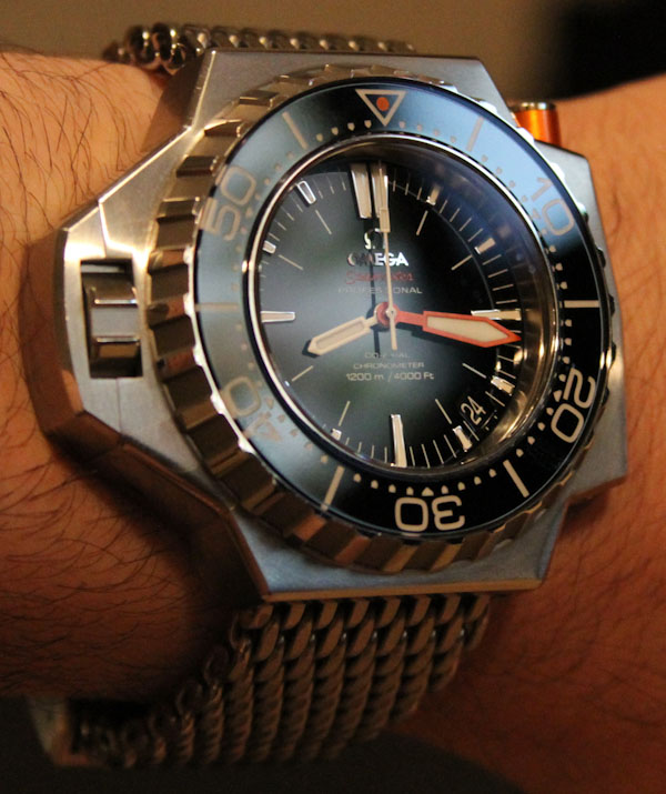 原來的 Ploprof 寬 54 毫米,高 45 毫米,而新的 Ploprof 寬 55 毫米,高 48 毫米。較高的表殼有助于更好地框住表圈和表盤。表殼里有很多鋼,這不是輕量級的手表。網狀金屬手鏈的重量增加了。我不介意,但有些人會發現戴手表是一種鍛煉。我們都需要更多的鍛煉。盡管看起來很奇怪,但這個案子很舒服。雖然新的底蓋上有“海馬”雕刻細節,但它確實模仿了原版 Ploprof 的一些紋理,旨在防止手表四處滑動。高大平坦的背面也使表殼相對穩定。在我的中號手腕上,Seamaster Ploprof 1200 非常舒適且沉穩。如此之多以至于幾乎令人驚訝。