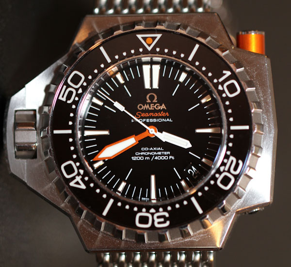 與大多數潛水員的表圈不同,歐米茄 Ploprof 上的表圈可以雙向旋轉。這使得它更容易設置。除非按下表殼右上角垂直對齊的按鈕,否則只能移動表圈。最初的型號是用塑料制成的,但歐米茄在 1200M 型號的按鈕周圍放了一個帶有橙色鋁環的金屬。起初,不得不用一只手按下按鈕并旋轉表圈是相當尷尬的。我擔心戴上潛水手套會怎樣。雖然我從來沒有戴手套測試過,但這個過程變得簡單而快速,現在我根本不介意或考慮它。我還喜歡假裝推動器是一根小天線。為了什么?我不知道……讓我有我的書呆子幻想。