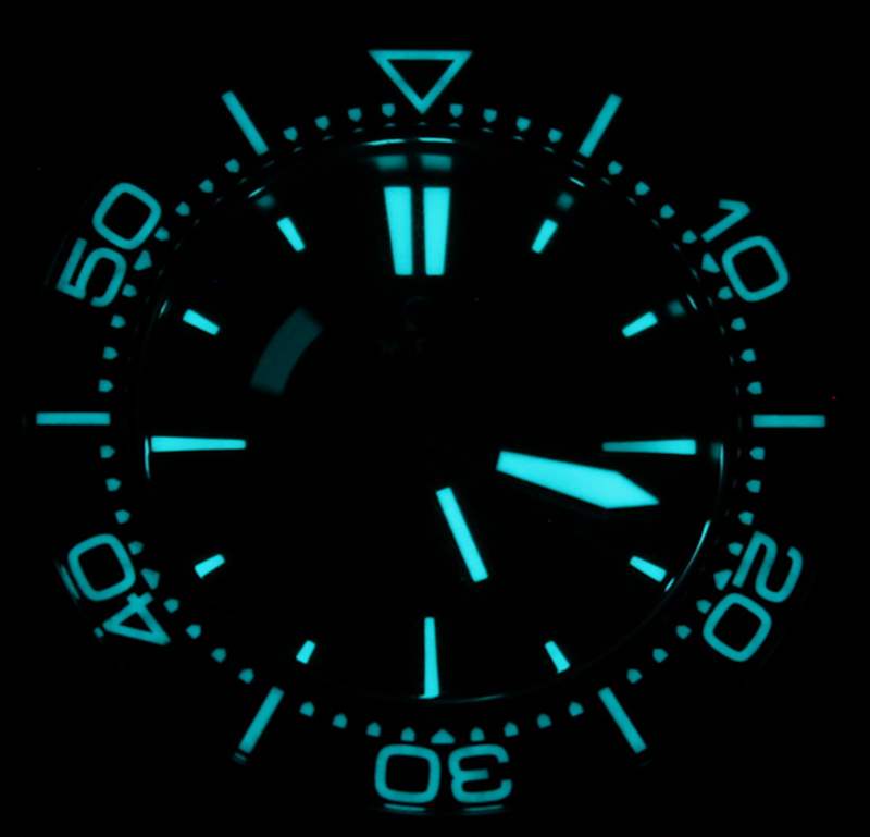 表殼設計的兩個最顯著特征是表圈旋轉系統和表冠保護裝置。讓我們從擋板開始。邊框本身又高又傾斜,非常漂亮。歐米茄為其鑲嵌了藍寶石水晶——這是對原版亞克力的重大升級。這些所謂的“藍寶石表圈”我自己非常看重,但現在更常見的是陶瓷表圈。歐米茄也在其他 Seamaster 型號上以基本陶瓷或液態金屬表圈的形式提供這些。假設您已經停止了工業流程,我相信陶瓷表圈比藍寶石表圈便宜。每一款都經久耐用,只是審美不同。藍寶石表圈的美妙之處在于,由于表盤水晶,它們在視覺上與表盤融為一體。藍寶石下方是一個標準的分鐘刻度陣列,上面涂有很多發光體。表盤上使用了更多的SuperLumiNova。從黑暗觀察的角度來看,這是一款非常明亮的手表——流明質量和音量的高分。