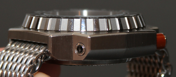 案例細節令人印象深刻。您可以看到拋光的多面邊緣和集成良好的零件。案件的形狀很快就會在你身上成長,但它并非沒有怪癖。巨大的表殼非常堅固,防水深度為 1,200 米。這是原來的 600 米防水等級的兩倍。盡管報告似乎表明原始和新的 Ploprof 都可以超過其深度等級。“在家嘗試”可能不是一個好主意(你住在水下嗎?)。該表殼還包括一個自動排氦閥,以確保您可以下到那么深,而不會從鍍有 AR 涂層的藍寶石水晶中噴出氦氣。