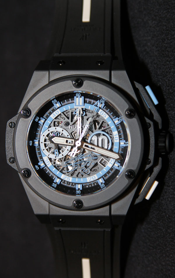 最新的限量版手表稱為 Hublot King Power Maradona 限量版 – 非常漂亮。雖然手表上有明顯的“馬拉多納品牌”,但您無需成為忠實粉絲也能欣賞這件作品。實際上有兩個版本。除了這款黑色、白色和藍色陶瓷表款外,還有一款 18k 王金表殼表款。King Power 風格表殼寬 48 毫米,啞光黑色陶瓷表殼與鏤空表盤相得益彰。我真的很喜歡天藍色的暗示和不同顏色的計時碼表按鈕。