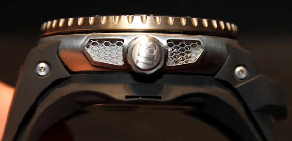 表盤使用兩根精確的指針顯示當(dāng)前深度、最大深度和用于計(jì)時(shí)減壓時(shí)間的逆行 5 分鐘計(jì)數(shù)器。那只手可以隨時(shí)重置。是的,它也有時(shí)間。這一切都?xì)w功于寶珀自制的自動(dòng)機(jī)械機(jī)芯。深度計(jì)也是機(jī)械式的,在表殼上使用壓力膜,上面覆蓋著小塊六邊形光柵——實(shí)際上看起來(lái)很酷。