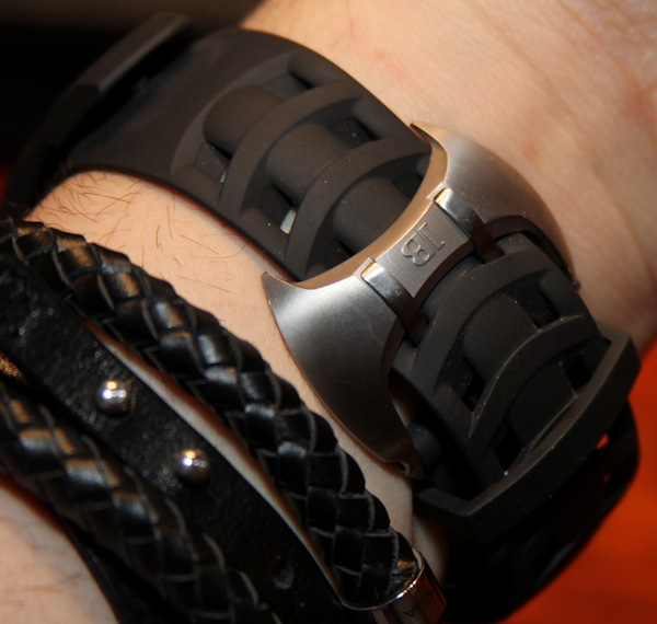 這塊表寬近 56 毫米,相當(dāng)龐大——尤其是考慮到表殼和表帶的設(shè)計(jì)。雖然 X Fathoms 手表由鈦制成,但它并沒(méi)有那么重。與 50 噚腕表流行的表圈風(fēng)格一脈相承,旋轉(zhuǎn)表圈頂部飾有弧形藍(lán)寶石水晶。這款手表真正充分利用了它的尺寸,它會(huì)像為水下蝙蝠俠制作的工具一樣貼在你的手腕上。說(shuō)到蝙蝠俠,搭扣上的那個(gè)鈦金屬搭扣看起來(lái)有點(diǎn)像他的標(biāo)志吧?特別是使用方便的字母“B”。我想我看到了未來(lái)的合作。布魯斯·韋恩 (Bruce Wayne) 肯定會(huì)佩戴 Blancpain——這是肯定的。Blancpain 應(yīng)該制作一套包含兩塊手表(或者可能是一塊可轉(zhuǎn)換手表)的手表,既適合布魯斯韋恩的正裝,也適合蝙蝠俠的高科技耐用需求。