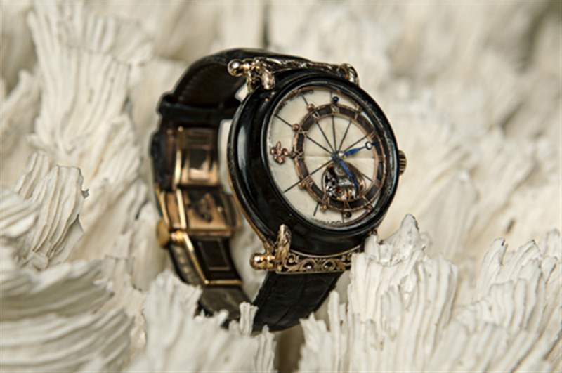 這些箱子看起來像是舊家具的零件。其實很多手表看起來都是用舊家具做的。例如,根據該品牌的說法,表盤上的一些部件中有象牙——這是從卡特里娜颶風過后發現的一架舊鋼琴中回收的。據說這些手表有航海主題。我有點明白。實際的表盤是偏心的。他們很酷,看起來很“古董”。每個表盤上都有一個 18k 金百合花符號。