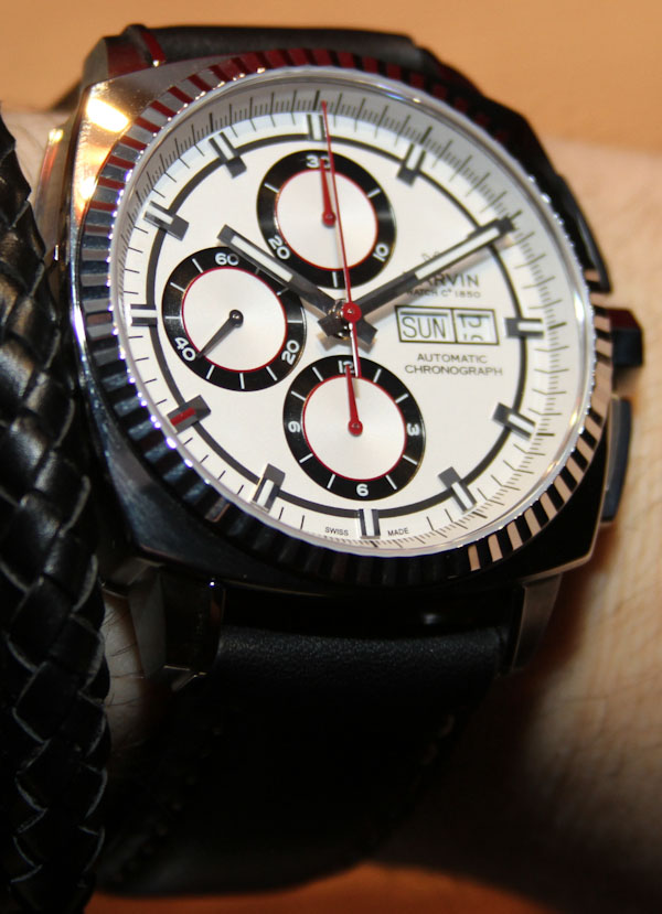 表殼寬 42 毫米,采用精鋼制成,防水深度達 50 米。計時按鈕的集成是現代的。像這樣的東西使舊的柱塞式推動器看起來……。好老。目前,Marvin Malton Cushion 計時碼表將提供奶油色配黑色或黑色配銀色表盤。