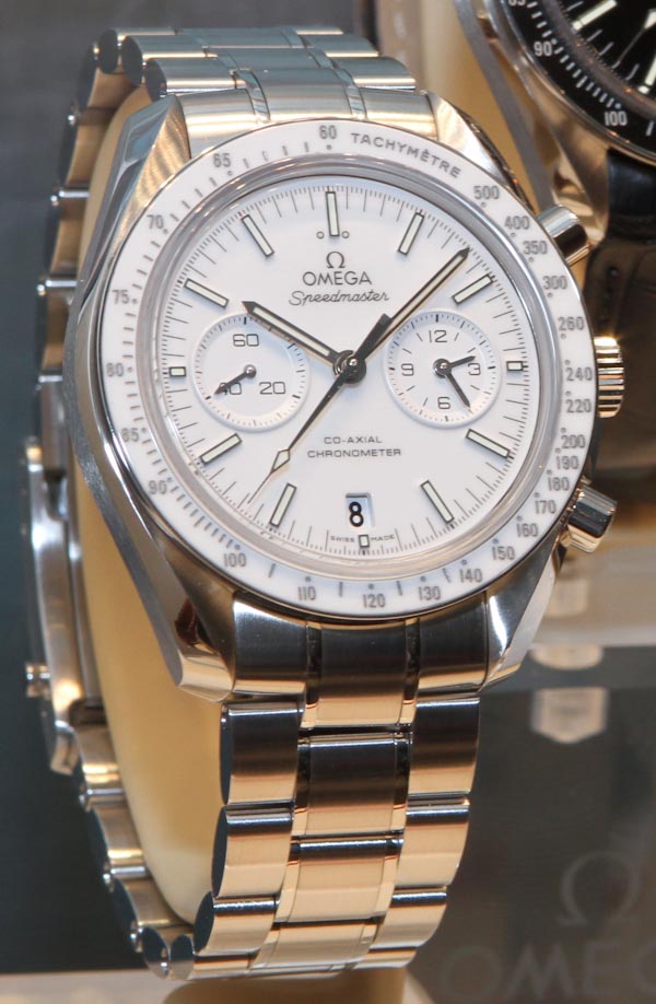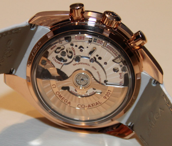 就像我說的,這里的主要吸引力在于除了手表是白色的外,它們還清晰易讀。表盤上混合的飾面和拋光確保了這一點。如您所知,這些較大的超霸表款的寬度剛剛超過 44 毫米,搭載了迄今為止最熱門的歐米茄機芯。我在其他地方討論過 9300,但它是一款內部制造的歐米茄自動 12 小時計時碼表機芯,具有硅游絲和同軸擒縱機構。9301 版本是完全相同的東西,但在擺輪上有一個金橋和一個金轉子。9301 機芯用于更高端的 18k 金超霸(或其他型號)手表。