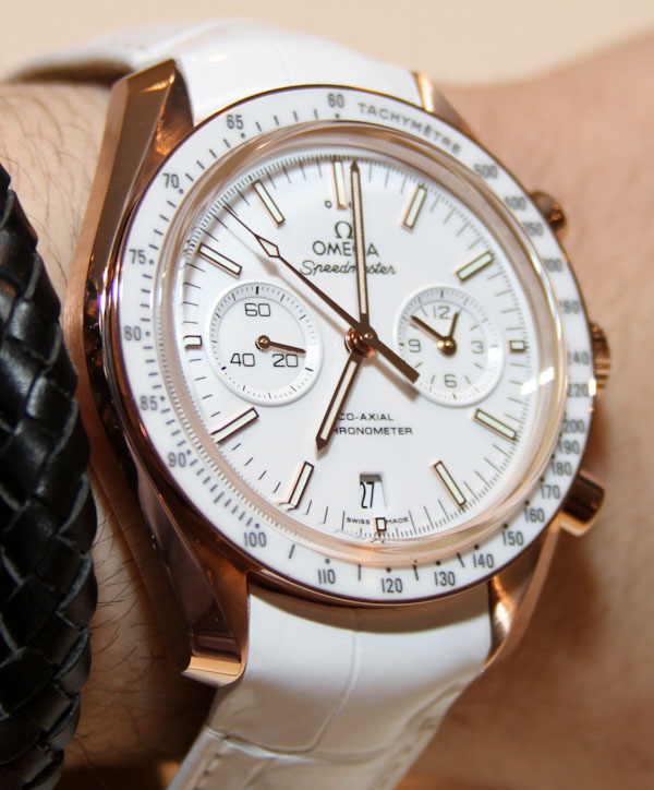 我的猜測是,大多數人會在精鋼表鏈上佩戴這款白色超霸腕表,因為它確實提供了非常帥氣的外觀。他們可能會為特殊的泳池邊或海灘場合選擇白色鱷魚皮表帶。橙金版本是另一回事,它是歐米茄使用的一種黃金合金,與黑色和白色的搭配同樣出色。