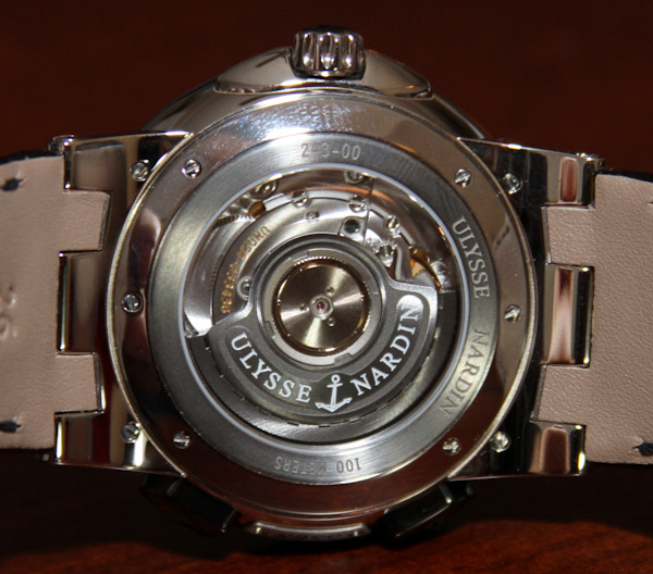 Ulysse Nardin 做得很好,讓這個案例變得有趣,但又不會太奇怪。完全拋光,表面處理做得很好,表殼上的小細節防止它變得乏味。表耳上的專有表帶連接迫使您只購買雅典表表帶,但您可能會爭辯說它值得獨特的外觀。甚至可以很容易地欣賞到表冠護罩和表冠上貼有聯合國標志的細節。表殼的另一側是兩個陶瓷按鈕和一個序列號盤。雖然這不是一款限量版手表,但雅典表喜歡用印有其獨特序列號的盤子來個性化每一件作品。