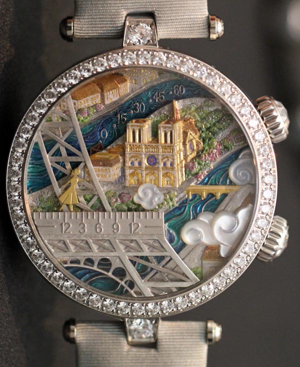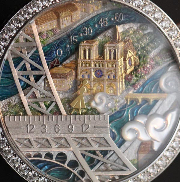 我們孤獨的姑娘站在同一座埃菲爾鐵塔上的女士裝。背景是巴黎圣母院——配有彩色玻璃窗。這些手表旨在作為故事中男人和女人的視角。表盤是華麗的作品。完全手工制作,每件都經(jīng)過數(shù)小時的雕刻、繪畫、成型和鑲嵌。一個表盤可能需要數(shù)周或數(shù)月才能完全完成。表盤大多采用金質(zhì)雕刻,搭配琺瑯工藝、珍珠母貝雕刻和微繪。