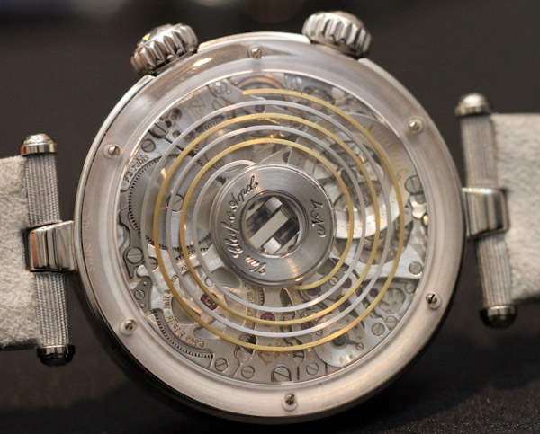 將手表翻轉(zhuǎn)過來,欣賞美麗的機(jī)芯,您會發(fā)現(xiàn)一些驚喜。首先是功系統(tǒng)。音簧實際上不是附在機(jī)芯上,而是附在后藍(lán)寶石水晶底蓋窗口上。這樣做是為了增加共鳴——從而增加三問報時聲音的音量。您還可以在幾個單獨的刻度盤上看到返回時間,這些刻度盤允許您查看和設(shè)置時間。獨家瑞士機(jī)械機(jī)芯,手動上鏈,動力儲存約60小時。正如您所看到的,與“有用”本身相比,復(fù)雜功能更有趣、更情緒化。當(dāng)然是“詩意復(fù)雜功能”的標(biāo)志。
