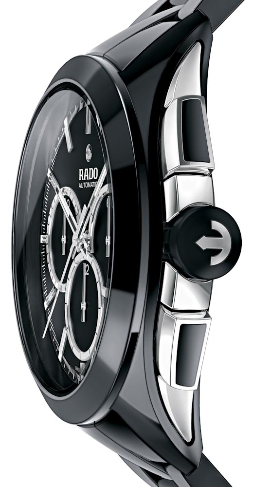這里的男款采用黑色陶瓷制成,帶有鋼制按鈕(鑲有陶瓷件)。表冠涂有橡膠。表殼寬 45 毫米,優雅運動。這個設計讓我想起了一些最近的摩凡陀作品。這件作品被稱為 Rado HyperChrome Automatic Chronograph XXL(我想會有更小的也有這樣的名字)。表殼和表鏈看起來很棒,表盤非常傳統,帶有現代簡約元素。