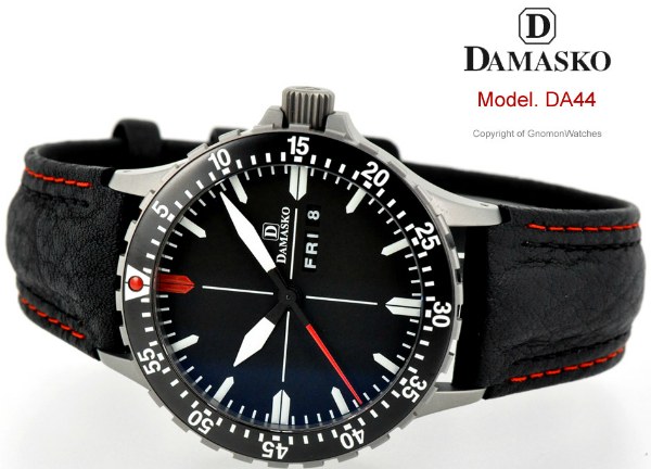 DA44 內部是大馬士革規范的瑞士 ETA 2836 自動機芯。我在手表上看到的照片顯示它裝飾得很漂亮。這款手表的表盤上有星期/日期指示器,值得慶幸的是 Damasko 使用黑色圓盤作為這些指示器。與表殼相連的是帶有紅色縫線的貼身皮革表帶或橡膠表帶。