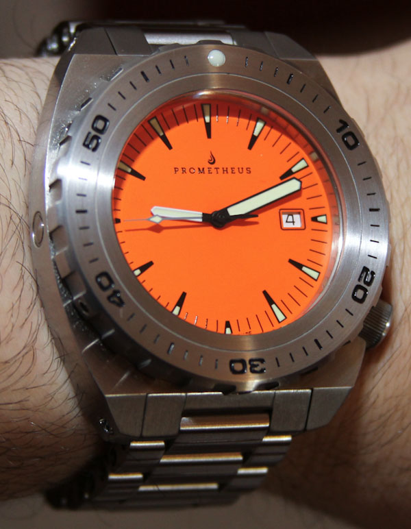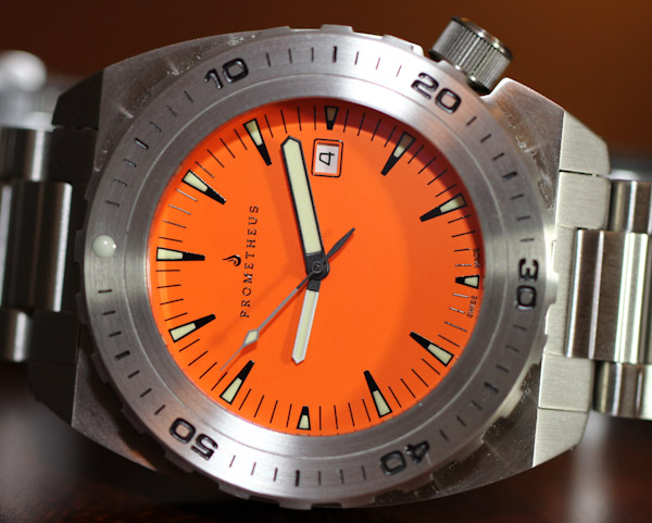 表盤很好,但可能是我唯一建議普羅米修斯改進(jìn)的地方。在我看來(lái),他們感覺(jué)有點(diǎn)平淡。這尤其是由于表盤的深度以及表殼又大又厚的緣故。還有其他版本的表盤帶有應(yīng)用的小時(shí)指示器,可能感覺(jué)不那么平坦。這沒(méi)什么大不了的,但值得一提。