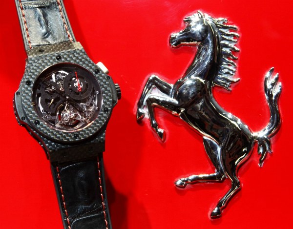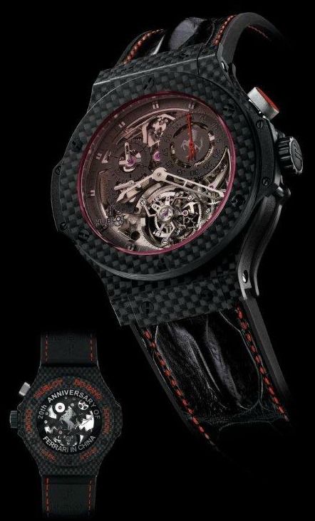 它在這里。這是兩個品牌合作推出的第一款法拉利品牌宇舶時計。這款名為 Hublot Big Bang Chrono Tourbillon Ferrari 的手表在中國亮相,旨在慶祝第一輛法拉利汽車在中國銷售 20 周年。我什至不認為那里的經銷商知道這件事。