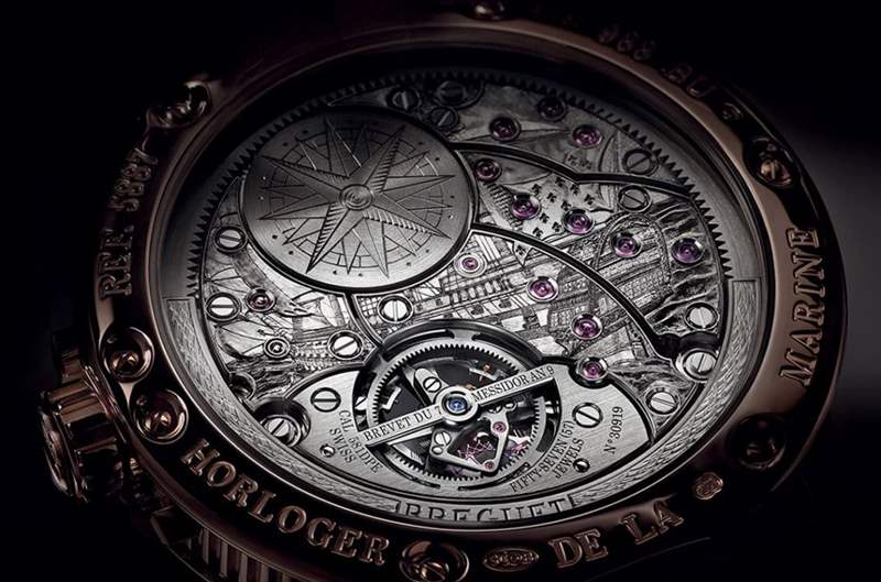 為了追求走時的精準(zhǔn)性,寶璣大師從鐘表的心臟——擒縱系統(tǒng)著手改良,發(fā)明了多種設(shè)計,當(dāng)中又以自由擒縱裝置最為特殊,讓擒縱與擺輪在動力傳導(dǎo)后即完全分開,彼此接觸面與摩擦?xí)r間都能縮短,以提升其精準(zhǔn)度;或是讓游絲擴(kuò)張與收縮具有更多空間的雙層游絲,就連在懷表時代看似作用不大的避震器(在寶璣大師所處的年代,懷表很少會因為撞擊而造成軸心損害),以分離的寶石軸承與極富彈性的簧片結(jié)構(gòu)打造出降落傘式避震裝置,他先一步提出避震器的概念,可見其前瞻性的思維。不可不提的還有視覺效果美妙無窮的陀飛輪,寶璣大師以此機(jī)制架空擒縱機(jī)構(gòu)的想法,一舉克服了當(dāng)時懷表受到地心引力的誤差影響,至今還是最廣為人知的復(fù)雜功能之一。
