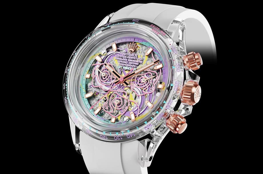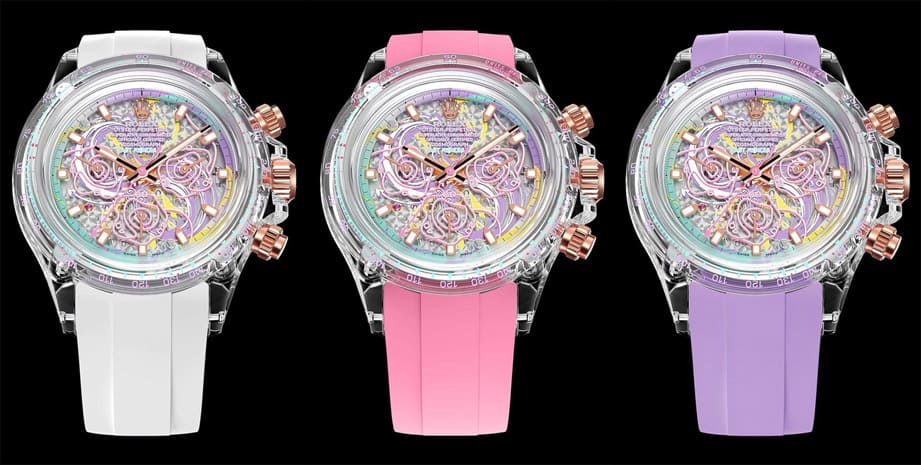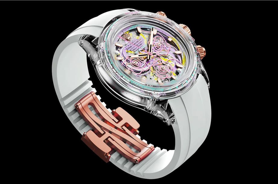 至于面盤上的圖案就更無拘無束了,乍看會覺得面盤有點繁雜,但還好時標、指針與勞力士皇冠標志都還保留永恒玫瑰金材質,不過其中中央計時秒針被改成了粉紅色,以此再次呼應手表的愛神主題。透明面盤的圖案大致可以分成三個層次,其中最下方的是黃色不規則線條,中間是粉紫色加上白色輪廓線的莫比烏斯環圖案,而最上層的圖案剛好化作Daytona的三枚計時小表盤,AET REMOULD以玫瑰花造型取代傳統制式的圓形小表盤,雖然玫瑰花圖案本身是不規則的有機形狀,但是改裝表品牌還是適度保留了小時、分鐘與秒數刻度,讓佩戴者有機可循判別計時與走時資訊。