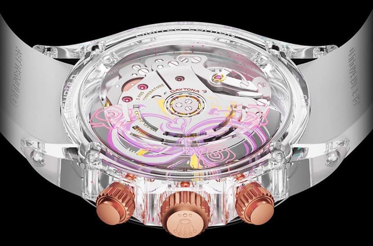 表殼為藍寶石水晶材質的Daytona ”Eros”表背當然也都是以相同材質制作,故能露出4130機芯的真面目,AET REMOULD沒有針對機芯進行明顯的改造,反而是在透明底蓋上做文章,在接近表冠一側的底蓋上,改裝表品牌加入和面盤正反呼應的莫比烏斯環與玫瑰花圖案,甚至還有愛心圖案,畫龍點睛地替原本嚴肅精確的機芯帶來一絲感性,讓Daytona不再只是一款經典賽車表,更多了藝術品般的美感。Daytona ”Eros”僅限量5只,要價95,000歐元(約合臺幣300萬出頭),看來想抓住這支愛神的箭,代價可不低。