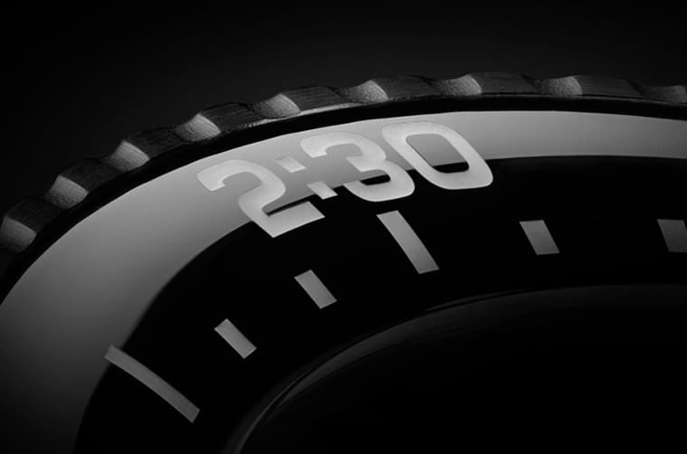 通常帶有單向旋轉表圈設計的潛水表,其表圈刻度會以60分鐘為準,其中有些作品會特別詳細列出前15~20分鐘刻度,讓佩戴者在計算下潛時間時能夠更精準地判讀,因此通常潛水表圈的分鐘刻度會在3、6、9點方向依序印上”15”、”30”與”45”的阿拉伯數字;然而五十噚Tech Gombessa明顯不同了,表圈改在2、4、6、8與10點方向印上阿拉伯數字,且它們依序是30、1、1:30、2和2:30,數字之間乍看好像有點跳躍,但其實品牌環繞表圈一周的單位不是常見的1小時,而是3小時,先有了這層認知后,在看到表圈上的數字就會有豁然開朗的體悟。
